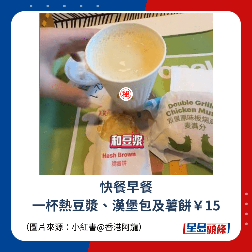 快餐早餐 一杯熱豆漿、漢堡包及薯餅¥15