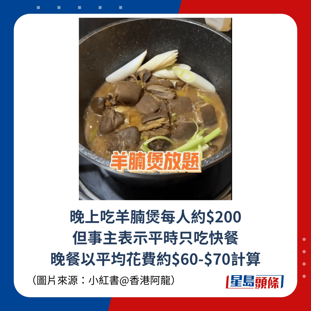 晚上吃羊腩煲每人約$200 但事主表示平時只吃快餐 晚餐以平均花費約$60-$70計算