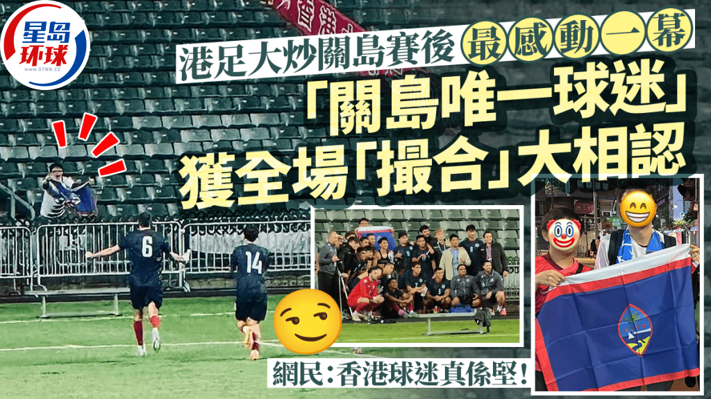 大球場昨晚(17日)東亞杯外圍賽決賽,香港隊5:0大炒關島,全城雀躍,賽后出現最感動一幕,現場的“關島唯一球迷”在球隊敗比后,仍在觀眾席獨力揮舞旗幟打氣,但未被關島隊發現,最后全場香港球迷提醒下,成功“撮合”大相認,場面令人動容。