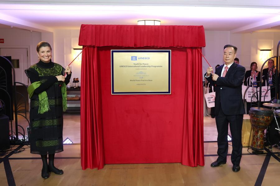 ▲12月12日,在西班牙馬德里,聯合國教科文組織社會及人文科學助理總干事加布里埃拉·拉莫斯(左)與澳大利亞-中國友好交流協會會長、僑鑫集團董事長周澤榮博士共同為“世界跨文化和平青年領袖項目”從都國際莊園“世界和平實踐基地”揭牌。新華社發 (澳大利亞-中國友好交流協會供圖)