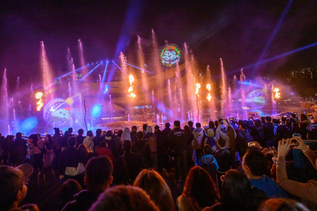 入夜了,一眾“熊貓”還未“休息”,原來齊集于水都人工湖,準備了加入冬日節慶元素的“光影盛夜-冬日慶典”光影匯演,長達8分鐘的演出不但有多個不同造型的熊貓透過光影“現身”,還加插了煙花、火花等震撼效果,加上氣氛熱鬧的圣誕節慶音樂,讓小朋友忍不住“嘩嘩”聲!
