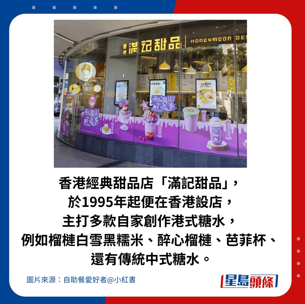香港經典甜品店「滿記甜品」,于1995年起便在香港設店,主打多款自家創作港式糖水, 例如榴蓮白雪黑糯米、醉心榴蓮、芭菲杯、還有傳統中式糖水。