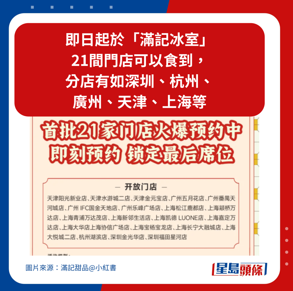即日起于「滿記冰室」 21間門店可以食到,分店有如深圳、杭州、 廣州、天津、上海等。