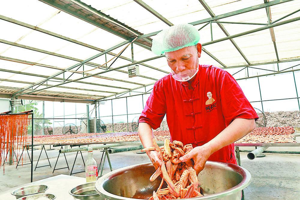 原料清洗干凈后放入陶缸當中,隨后依次加入特定比例的調料,攪拌均勻后腌制。腌制的時間約16小時,其間還要加入醬油,每隔一段時間都要將缸裹的原料等攪拌翻轉,使各種材料均勻入味。鴨扎包晾曬時長為3至4天,每天將原料等翻轉兩次,使其盡量地出油、收縮,曬至八成干左右,鴨扎包的半成品制成。
