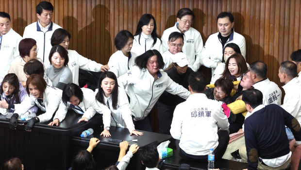 ▲“立法院”會20日處理選罷法、“憲法”訴訟法及財劃法修正草案,民進黨多名“立委”進入議場后鎖門,綠營“立委”則韓領主席臺及側門互相對峙,藍營破門進入議場,將綠委一位位請走。