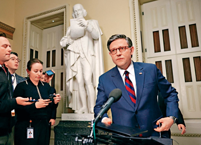 ▲眾議院議長約翰遜周四在國會議事廳外見記者。