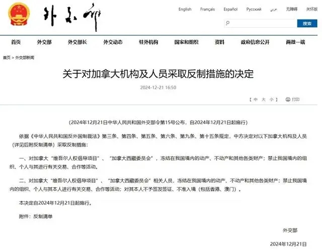 一、對加拿大“維吾爾人權倡導項目”、“加拿大西藏委員會”,凍結在我國境內的動產、不動產和其他各類財產;禁止我國境內的組織、個人與其進行有關交易、合作等活動。
