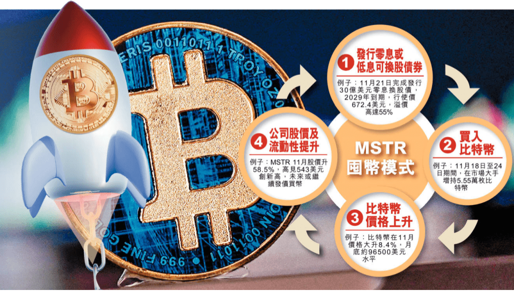 所謂MSTR囤幣模式,是指美國軟件開發商MicroStrategy,透過發行零息或低息可換股債券集資,用來大手掃入比特幣,并一幣不賣,在市場追捧下,刺激股價及股票流動性急升,繼而再發換股債集資,進一步推升股價,形成循環。