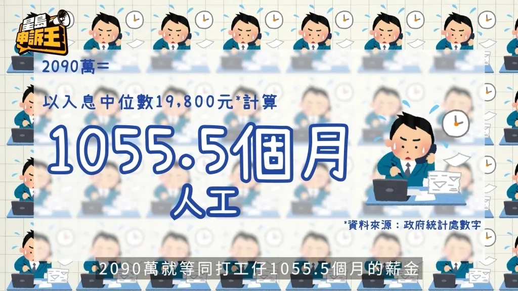 按港府統計處最新一季調查顯示,港人入息中位數平均為19800元,2090萬即等同打工仔約1055.5個月的薪金。星島記者訪問了多位市民,大部份受訪市民均認為2090萬是天文數字,一般打工仔或單靠工作薪金儲得,甚至有人笑言“只有富二代才能做到”,亦有人表示需要靠投資、買樓或買股票等輔助才能在退休時儲到2090萬。