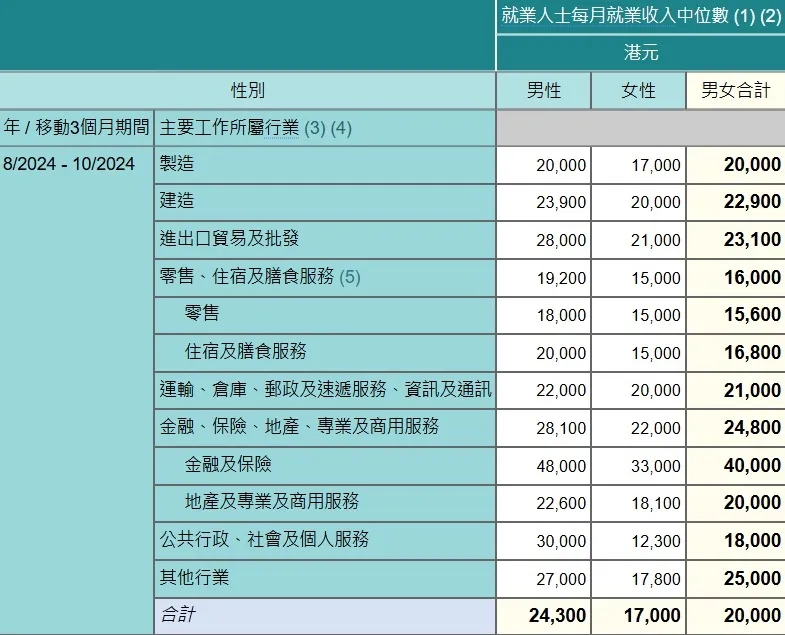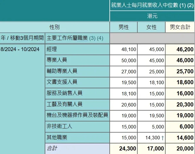 對此,香港統計處在今年8月至10月的就業人士月收入數據中,發現港人的就業收入中位數為21,900元。