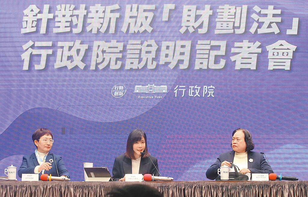 行政機構23日由財政部長莊翠云(左起)、行政院發言人李慧芝及行政院主計總處主計長陳淑姿舉行“行政院針對立法院三讀財政收支劃分法版本說明記者會”,表示新法一旦公布,明年度總預算會受到嚴重沖擊,甚至可能需要重新編列。