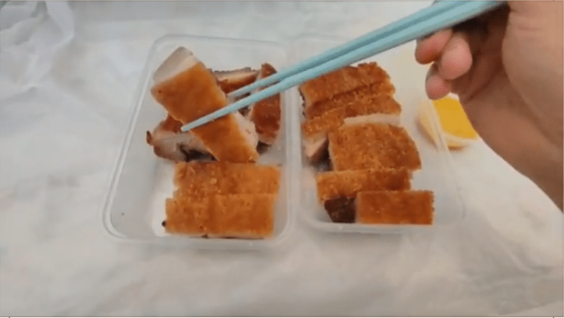▲在烚了4、5分鐘后,他目測指燒肉發大了約一半。圖片:香港仔猛料分享@Youtube頻道影片截圖