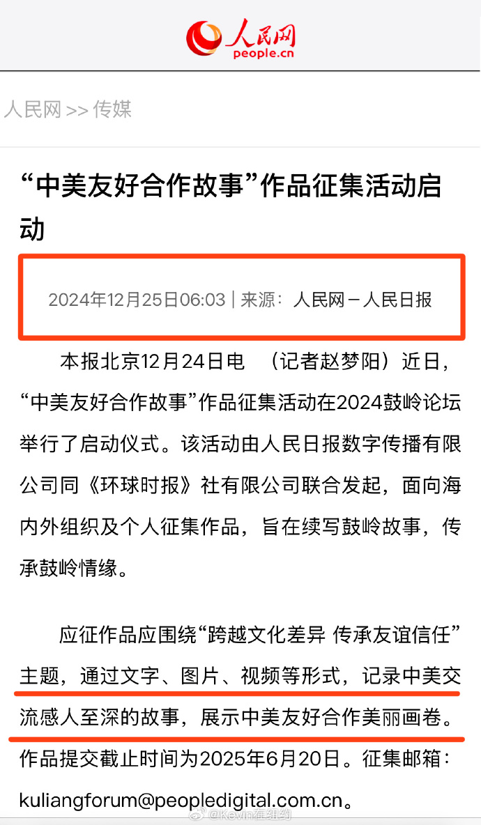 《人民日報》這則征集的短文內容為,近日,“中美友好合作故事”作品征集活動在2024鼓嶺論壇舉行了啟動儀式?;顒佑扇嗣袢請髷底謧鞑ビ邢薰九c環球時報社有限公司聯合發起,向海內外組織及個人征集作品,旨在“續寫鼓嶺故事,傳承鼓嶺情緣”。