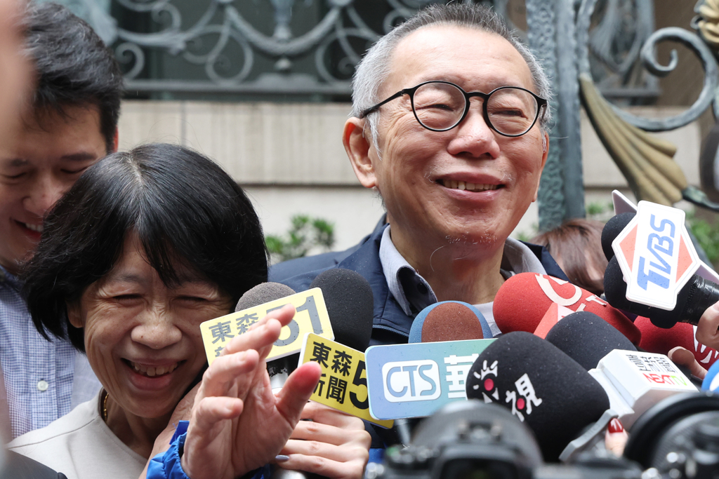 ▲臺北地檢署偵辦前臺北市長柯文哲涉及京華城容積率與政治獻金假帳案,在押的前臺北市長柯文哲移審法院后,北院27日裁定交保,完成交保后離開返家,妻子陳佩琪(左)出門迎接,受訪時陳緊貼身邊,柯則露出久違的笑容。(中時新聞網資料照)