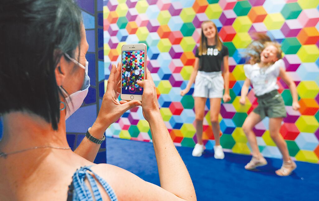 ▲美國共和黨總統當選人特朗普對TikTok態度之所以大轉彎,在于TikTok幫助他爭取年輕人支持、制造網路聲量上,功不可沒。圖為一名女子在比利時布魯塞爾的“微笑暢游”博物館內為兩名女孩錄制短片。新華社