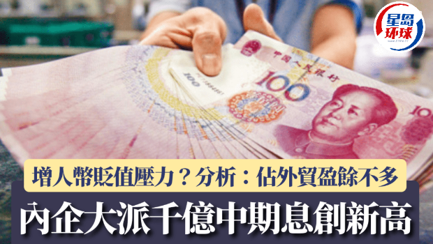 不少在港上市的中資企業響應內地年初的“國九條”改革,大幅增加派息,國有五大銀行更首次集體推出中期分紅計劃,在港股整體市道“麻麻”下,成為不少投資者鐘情對象,截至上周五收市計,五大內銀股股價較今年初股價升4成至6成,電訊股亦升3至6成。有分析估計,在港上市的內企明年首季派發中期息的總額逾千億元,市場擔憂內企須兌大量港元派息,恐增加人民幣貶值壓力;另有專家指出,內企派息占外貿盈余不多,帶來貶值壓力不大,而且明年第三季或會反彈。