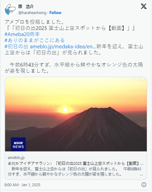 綜合NHK、SBS電視臺等日媒報導,富士山2025年第一道日出于清晨6時43分升起,SBS電視臺特地搭乘直升機飛越富士山捕捉絕美畫面。