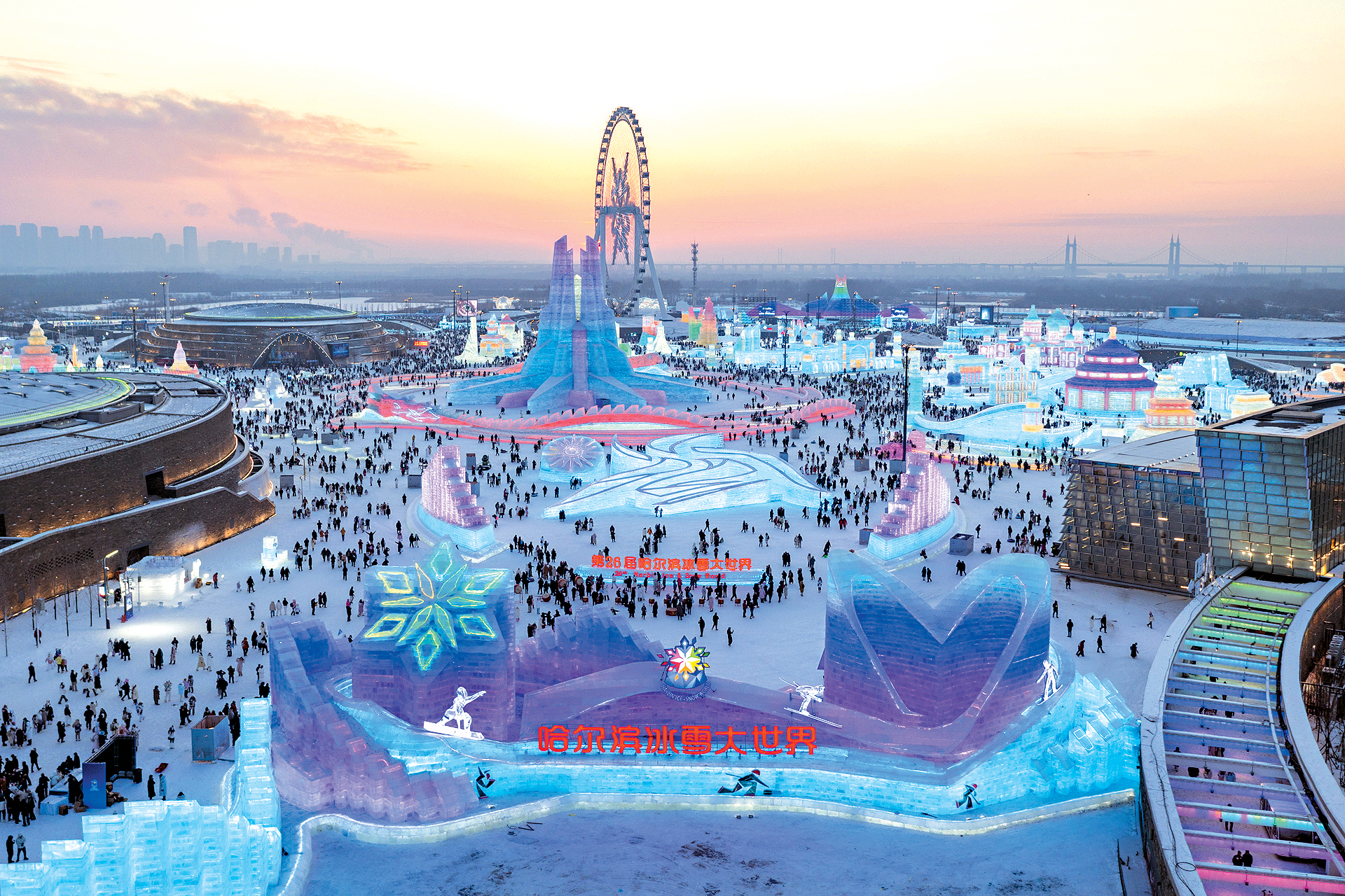 ▲第26屆哈爾濱冰雪大世界,占地100萬平方米,是舉世知名的冰雪游樂園地。