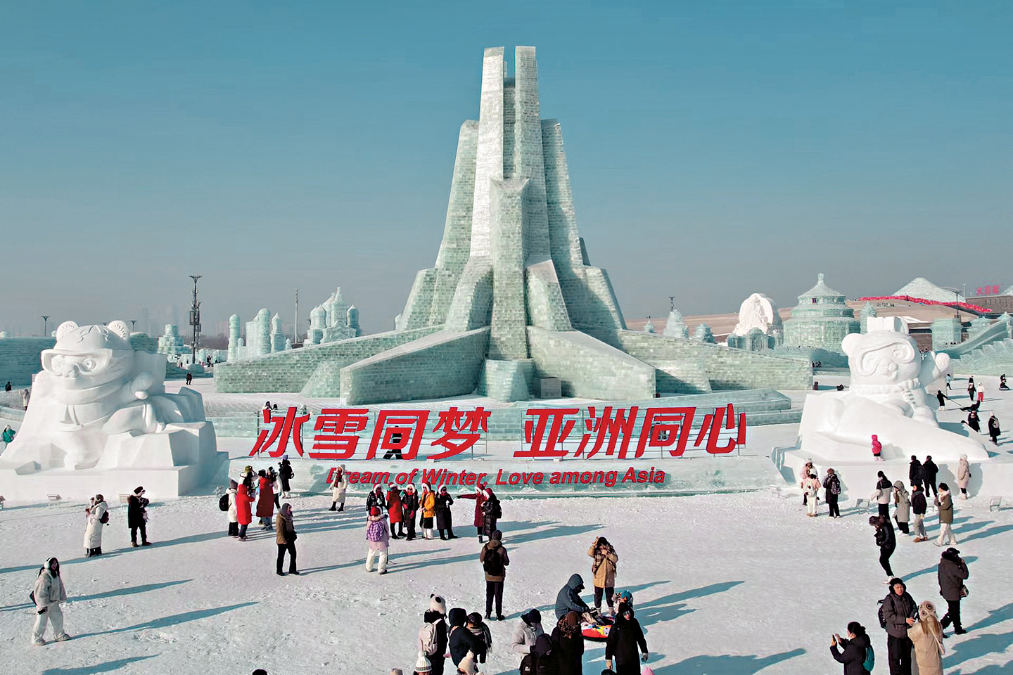 ▲為宣傳2月在哈爾濱舉行的亞洲冬季奧運會,本屆的冰雪大世界便以“冰雪同夢.亞洲同心”為主題。