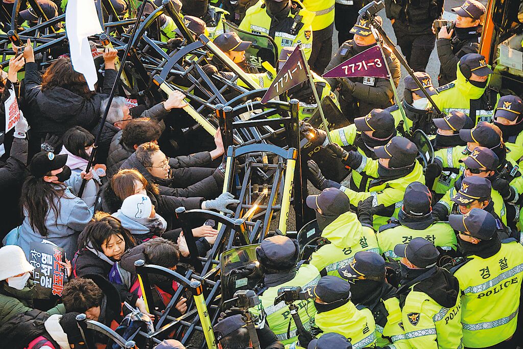 ▲韓國公調處人員周五與總統警衛處經過5個多小時對峙,仍無法逮捕被彈劾的總統尹錫悅。圖為反尹的抗議民眾,在總統官邸附近與警察發生沖突。(路透)