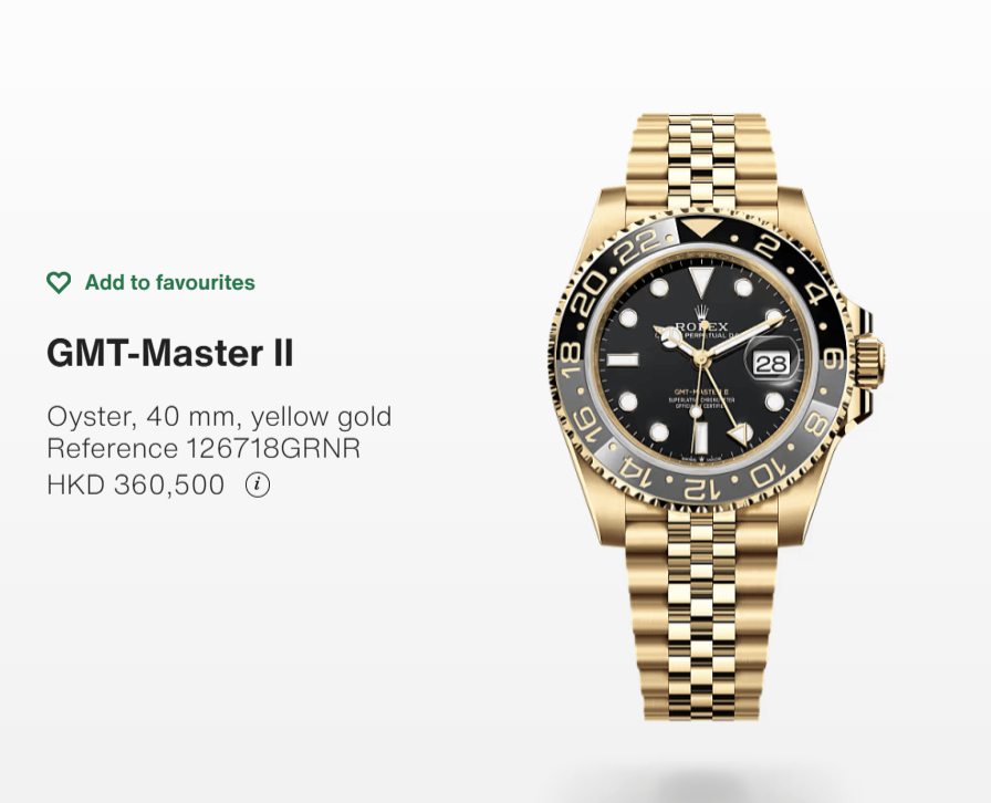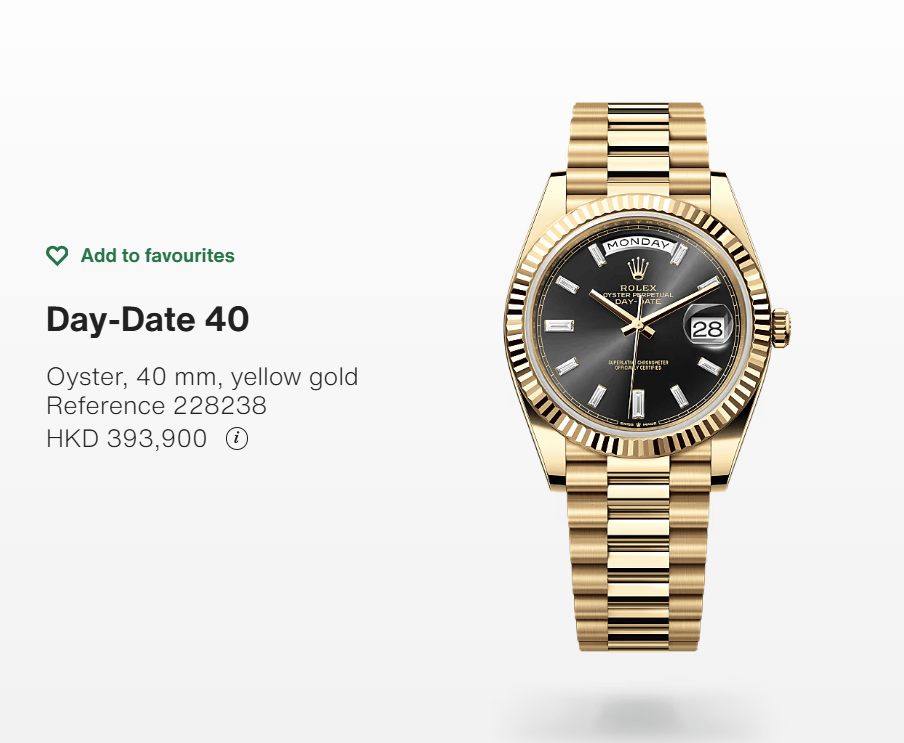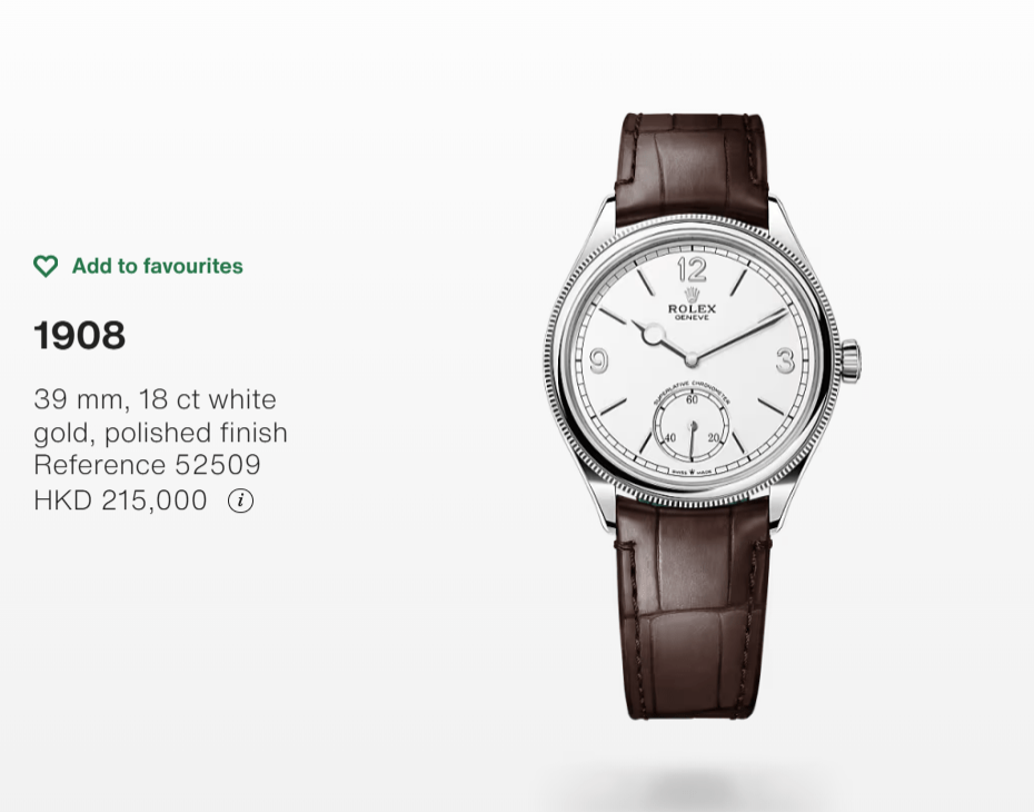 黃金款、配黑色表面的Day-Date 40由4.1萬歐元,加價至4.42萬歐元(香港官網顯示售價為39.39萬港元);黃金款的GMT-Master II由4.13萬歐元,加價至4.46萬歐元(香港售36.05萬港元);白金的勞力士1908亦加價5%,香港官網的售價為21.5萬港元。
