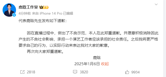 隨后,鹿晗工作室發文道歉!