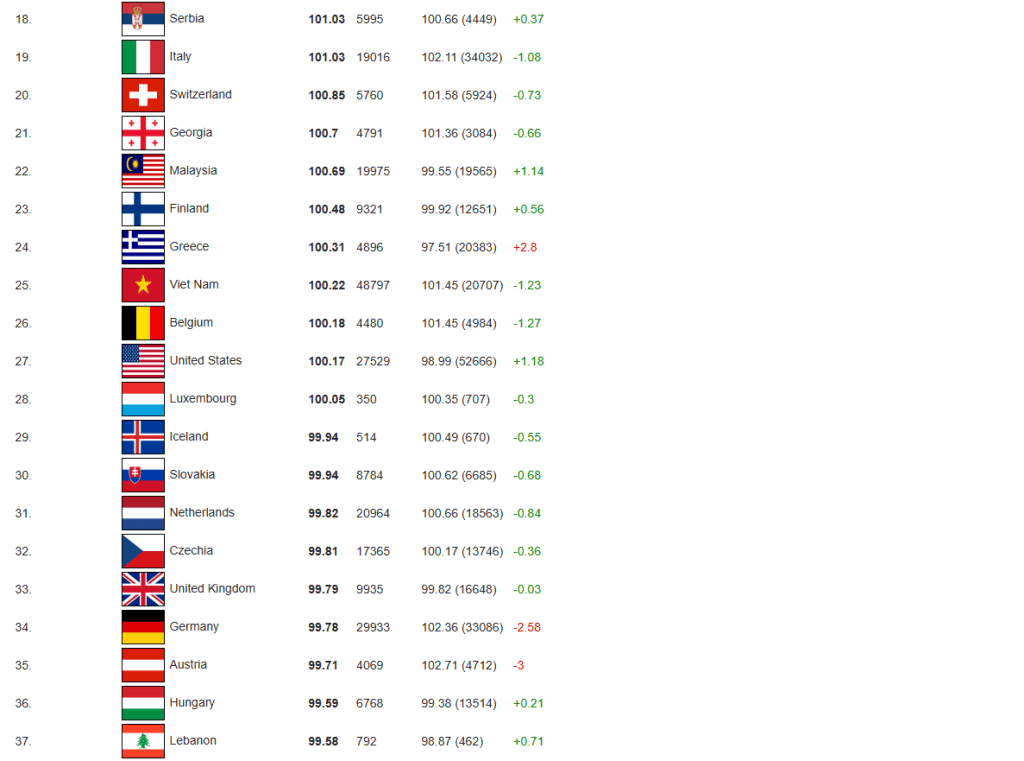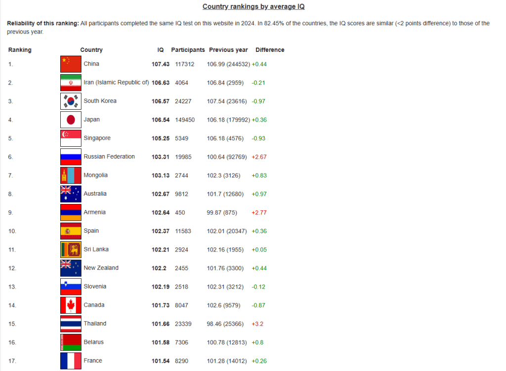 智商檢測機構International IQ Registry(國際智商登記處)公布最新數據,列出全球127個國家的智商排名。中國以平均智商107.43位居榜首,韓國、日本及新加坡分別奪得第3至第5名。俄羅斯則以平均智商103.31排名第6;美國則以100.17排名第27。