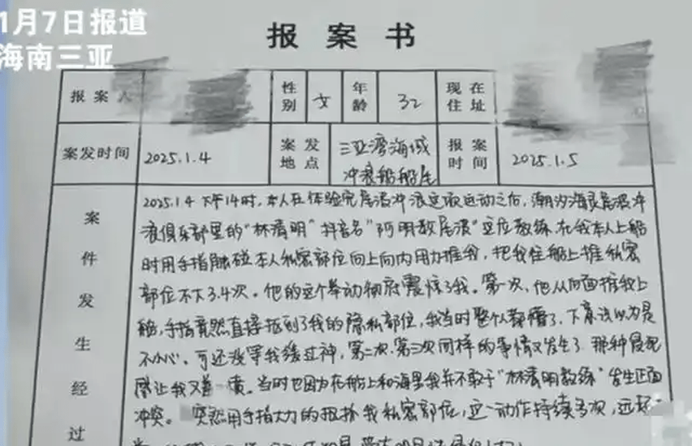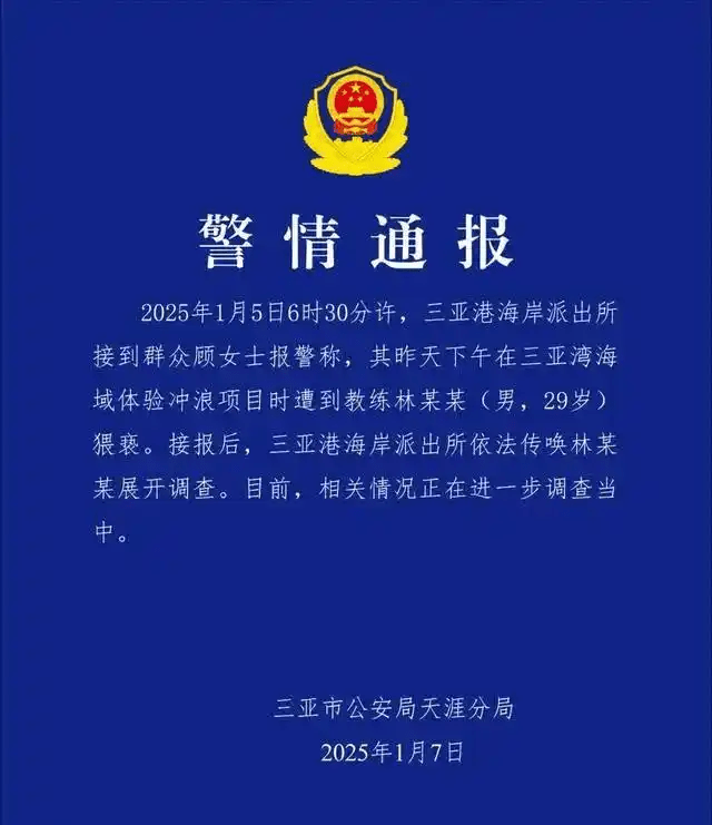 據三亞市公安局天涯分局1月7日晚發出警情通報:1月5日6時30分許,三亞港海岸派出所接到群眾顧女士報警稱,其昨(4日)天下午在三亞灣海域體驗沖浪項目時遭到29歲男教練林某某猥褻。 接報后,三亞港海岸派出所已傳喚林某某展開調查。 目前,相關情況正在進一步調查當中。