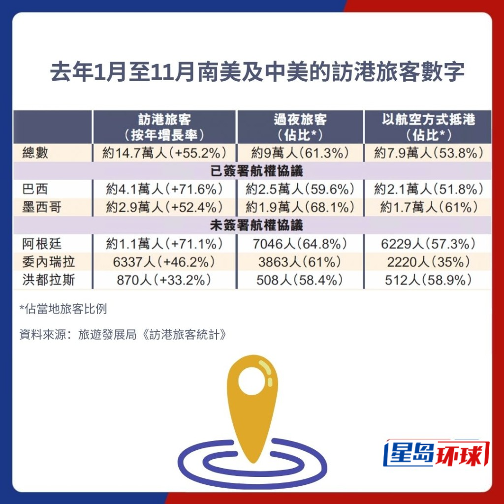 至于未有航權的地方,多為南美洲地區,如阿根廷、委內瑞拉、烏拉圭、智利、玻利維亞及秘魯。參考旅發局公布最新一份《訪港旅客統計》(月刊),2024年1至11月共有約14.7萬旅客由南美及中美訪港(見表),按年增長率達55%。以阿根廷為例,去年首11個月有約1.1萬人訪港,按年增長71.1%,當中60%旅客乘搭飛機來港。
