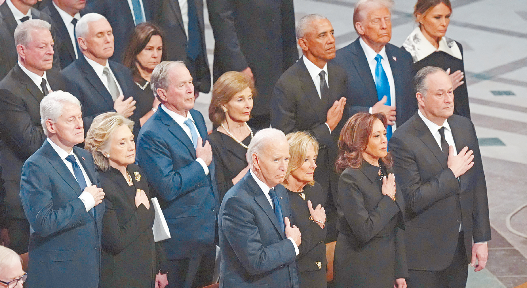 首都華盛頓的國家大教堂9日為已故總統卡特舉行盛大國葬,5名在世的前總統、現任總統及候任總統罕見地同場亮相??偨y拜登致詞時贊揚卡特品格高尚,尊重政壇和民間每一個人。
