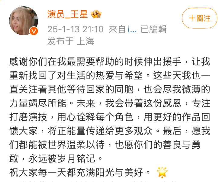 • 王星本人再發文感謝網友,表示“重新找回對生活的熱愛”