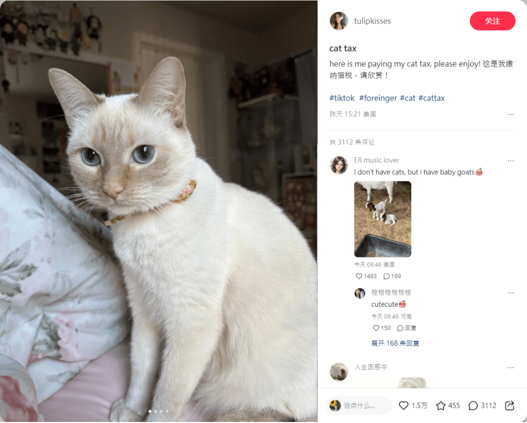 有趣的是,當美國網民在小紅書上發表貼文自我介紹時,總會附上自家貓咪的生活照,此舉立即引起內地網民共鳴,紛紛以自家寵物貓的照片進行熱情回應。這種互動模式迅速發酵,部份內地網民亦主動出擊,只要看到美國網民的貼文就會詢問,“家里有養貓嗎?能不能分享照片給我們看?”面對請求,美國網民亦欣然配合,樂于展示自家貓咪的可愛模樣。