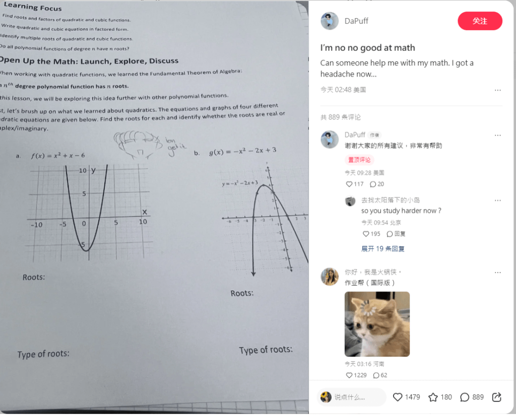 ▲不少內地學生在美國人的評論區中曬出題目照片,并詢問正確答案。