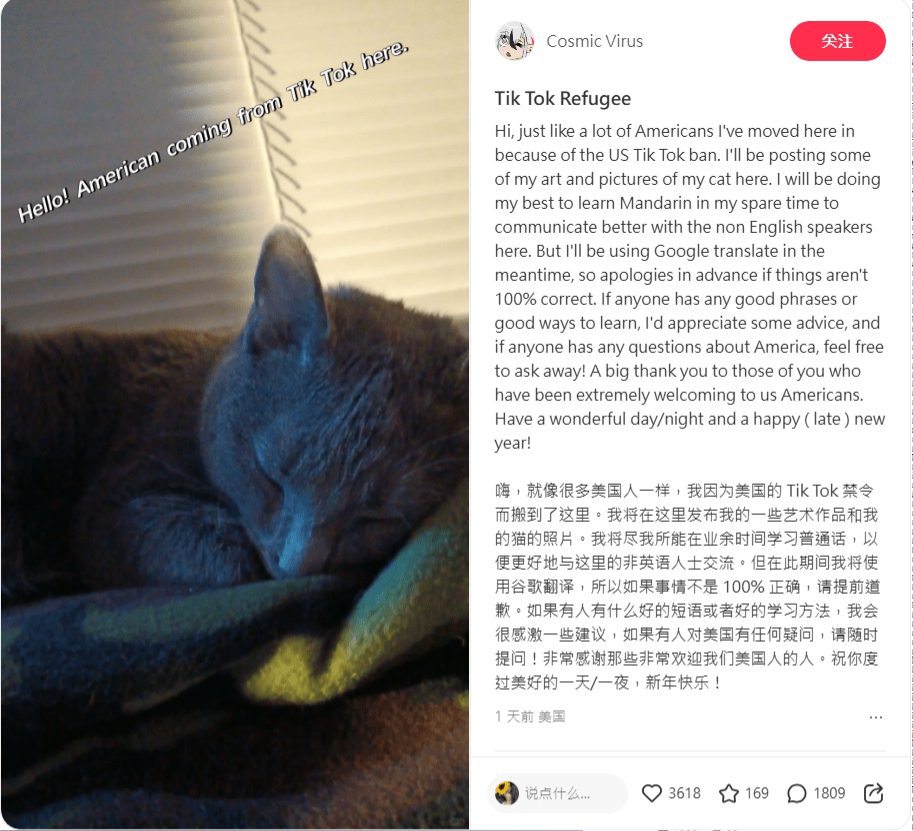 美國政府對TikTok實施禁令于周日(19日)生效前,大量TikTok美國用戶從周二(14日)起瘋狂涌入中國另一社交平臺小紅書(Rednote)。雖然小紅書仍未有翻譯功能,但完全不影響一批自稱為“TikTok refugee(難民)”的美國網民熱情,并與內地網民友好互動,其中分享可愛貓咪的圖片更已成為雙方交流的一種獨特社交禮儀。有關消息更帶動了多只在A股上市的“小紅書概念股”急升,以至漲停板。