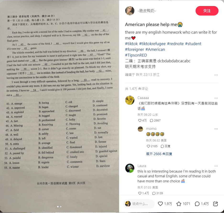 另一方面,大量美國人涌入小紅書,亦使部份苦于英文難題的內地網民得到“救星”,不少內地學生在美國人的評論區中曬出題目照片,并詢問正確答案,熱心的“英文母語者”亦給予解答。不過,對于不確定的題目,他們亦會用中文禮貌回覆,“我不知道,對不起”。