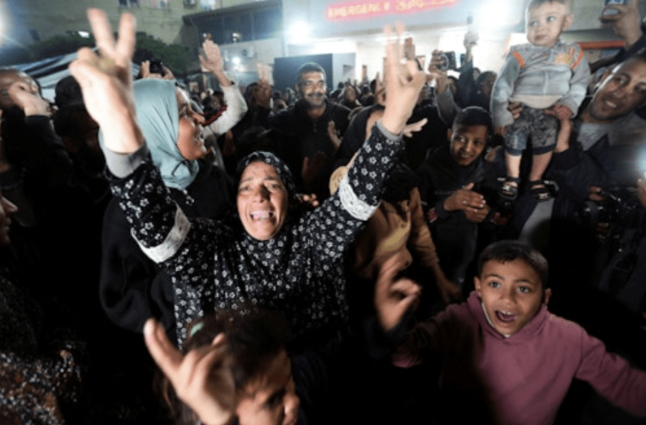 加沙居民經歷長達15個月的戰火蹂躪,面臨食物、水和燃料嚴重短缺困境,許多人無家可歸,當昨日?;鹣鏖_后,大量民眾涌上街頭,歡呼慶祝,整個街頭恍如變身嘉年華會舞臺?!拔液芨吲d,是的,我在哭,但那是喜悅的淚水?!绷麟x失所的五個孩子的母親加達說。