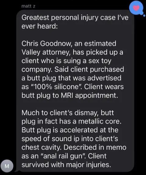 短訊稱:“我聽說過的最嚴重的人身傷害案件:資深律師古德諾接待了一位客戶,她起訴一家性玩具公司。該名顧客購買了一個肛塞,相關廣告中聲稱它為‘100%硅膠’。顧客戴著它去進行MRI掃描。令客戶沮喪的是,那個肛塞實際上內有金屬芯?!?/p>