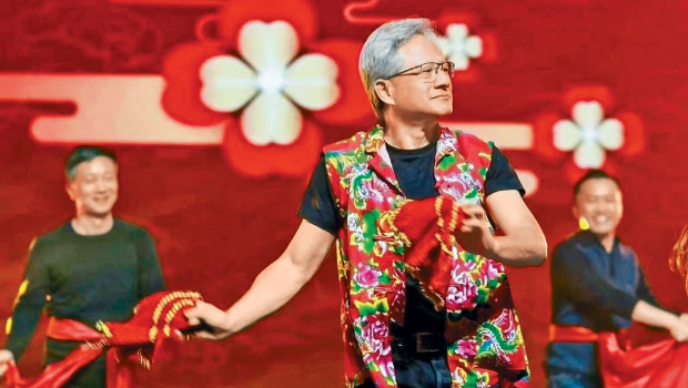 ▲黃仁勛去年在北京年會上身穿東北風格的“大花背心”,與員工們一起扭秧歌。