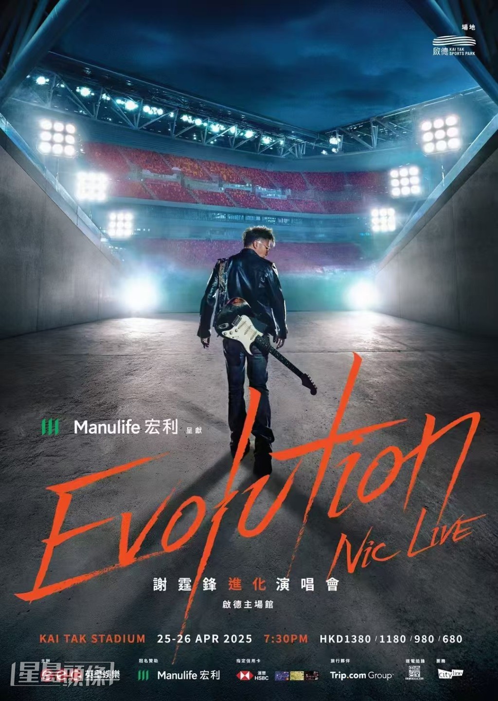 謝霆鋒《Manulife Presents Evolution Nic Live》演唱會將于2025年4月25至26日舉行兩場,演唱會門票票價分為$1380、$1180 、$980、$680。而滙豐信用卡用戶可享優先訂票,優先訂票日期為2025年1月22日晚上12時至1月23日晚上11時59分。