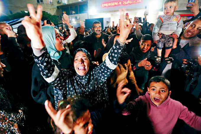 ▲加沙地帶中部代爾拜拉赫的居民,周三得知達成?;饏f議后歡喜若狂。