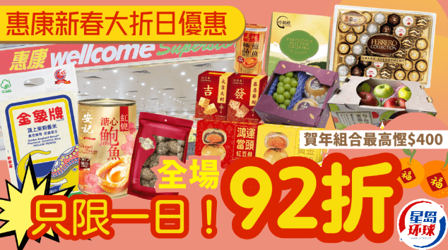 惠康新春優惠|臨近農歷新年,惠康超級市場特別推出迎春“大折日”優惠活動,顧客于1月18日到全線惠康門市或選用“網購店取”服務,買滿$168即可享92折優惠,而于網店買滿$988亦可享同樣優惠,只限1月18日一天!惠康同步推出多項精選貨品優惠組合,最多可慳$406.4,把握機會入年貨!