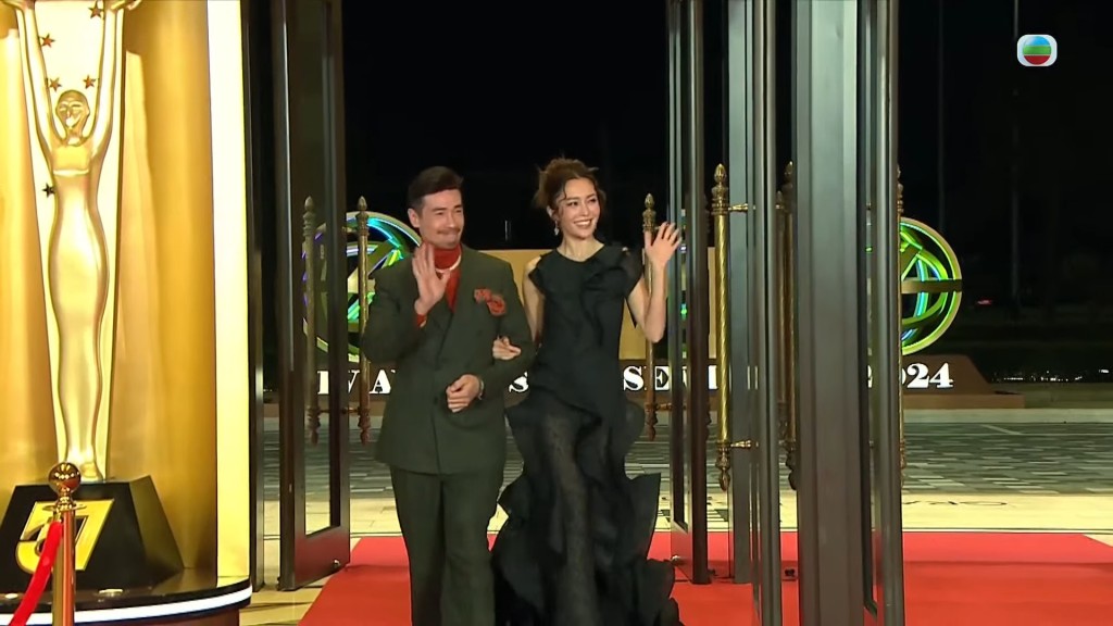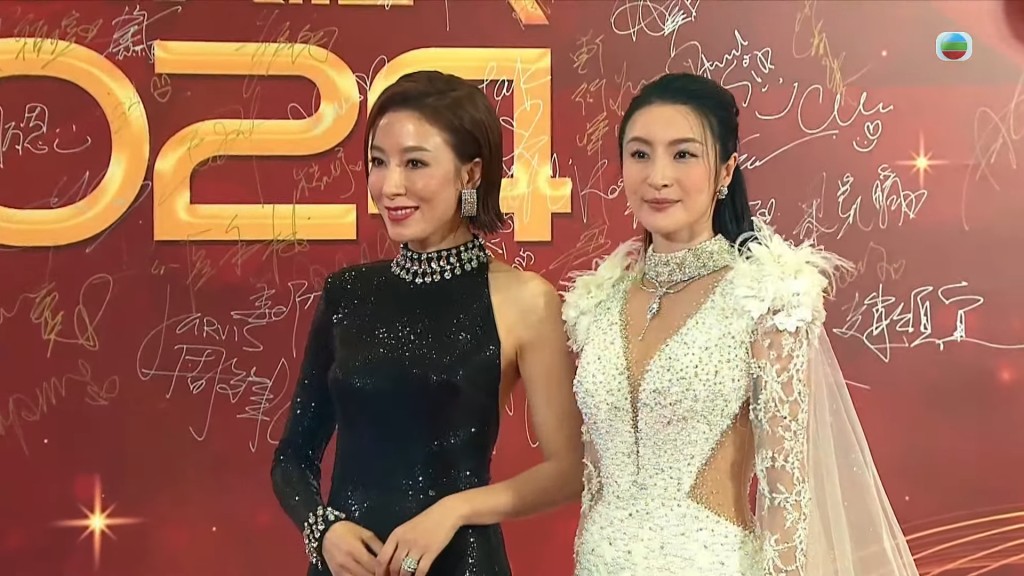 接著有梁敏巧、吳幸美、李旻芳等《東張西望》女主持入場,梁敏巧、吳幸美都以低胸打扮現身,上圍逼爆盡曬好身材,非常性感,極之搶鏡。而何泳芍則以白色晚裝Deep“U”亮相?!白罴雅鞒帧碧崦岁愜驳?、麥美恩、馮盈盈亦以深V示人,打扮高貴?!伴L腿女神”戴祖儀與趙頌宜、林智樂、黃樂妍一起進場,她罕有收起長腿,除了低胸吸睛,背后原來還有小透視露美背。羅子溢(前名:羅仲謙)與劇中“老婆”陳自瑤一起現身行紅地氈,然后急急腳走去照顧太太楊茜堯(前名:楊怡),同時照顧兩個“老婆”非常忙碌。陳自瑤今晚有份爭視后,她以低胸、高衩晚裝到場,氣勢強勁。