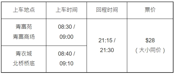 溢游旅行社宣布開通兩條全新”香園圍快線(蓮塘口岸)”,分別來往青衣及將軍澳。 快線由1月18日開始,逢星期六、日及公眾假期開出,每日來回四班。 青衣及將軍澳各設兩個上車點,青衣分別途徑青富苑青富商場及青衣城; 將軍澳則途徑富康花園將軍澳廣場及坑口南豐廣場。 青衣專線票價 $28,將軍澳專線票價 $35,大小同價。 以后北上又多一個方便選擇!