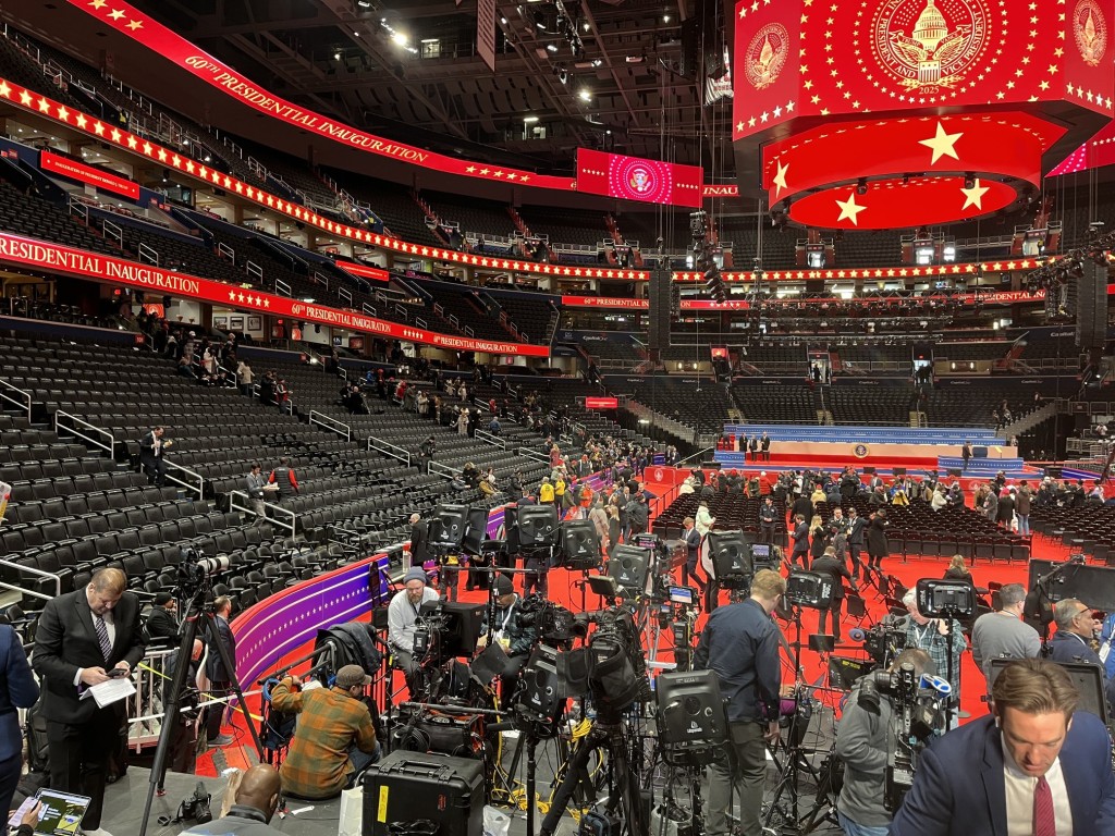 特朗普現身華盛頓一號體育館,作為就職儀式連串活動之一,在場者見他出現時,響起雷鳴般的掌聲,大批支持者高呼“戰斗”,向其致敬。