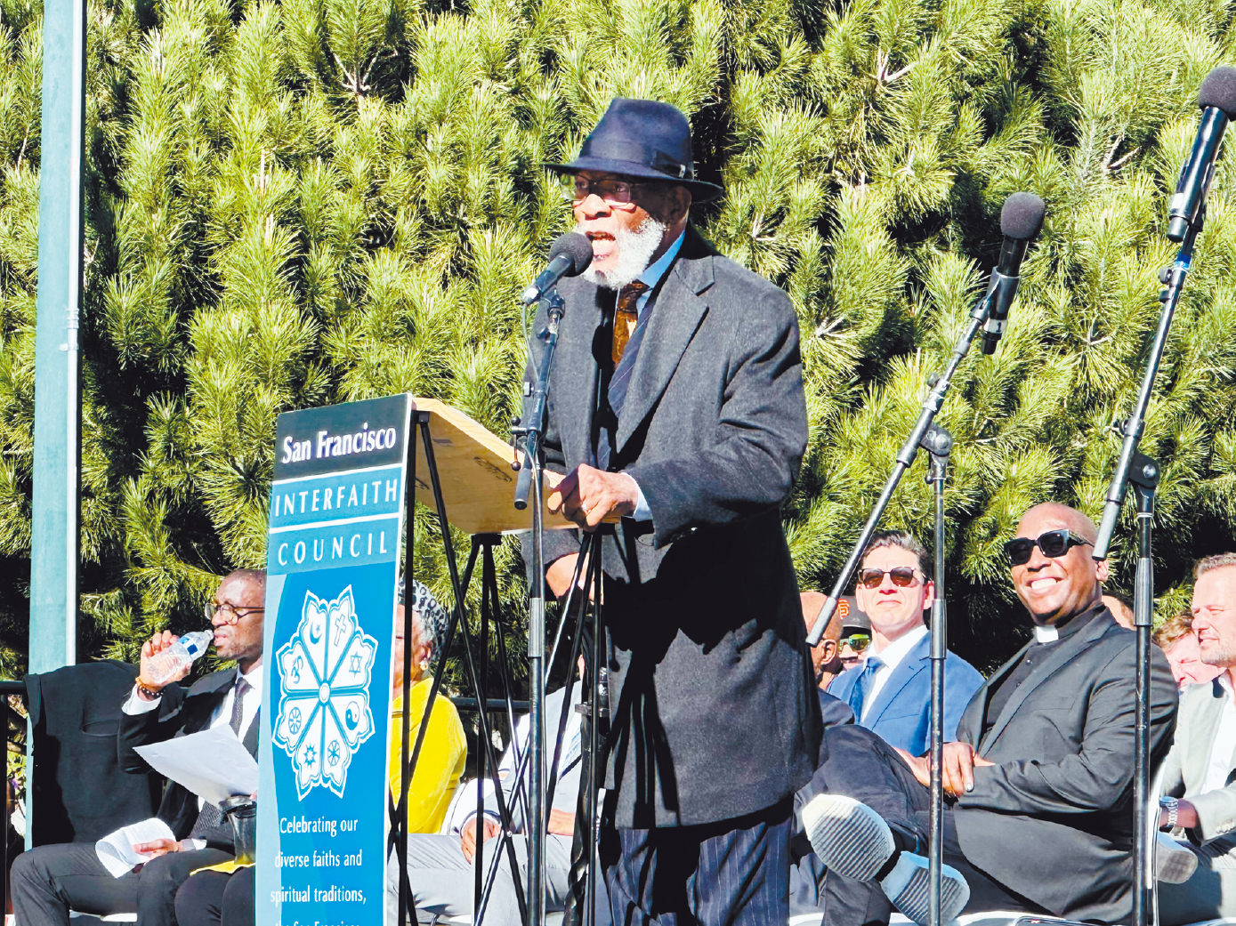 全國有色人種協進會舊金山分會主席布朗牧師發言批評“宗教右翼”。記者洪郁欣攝