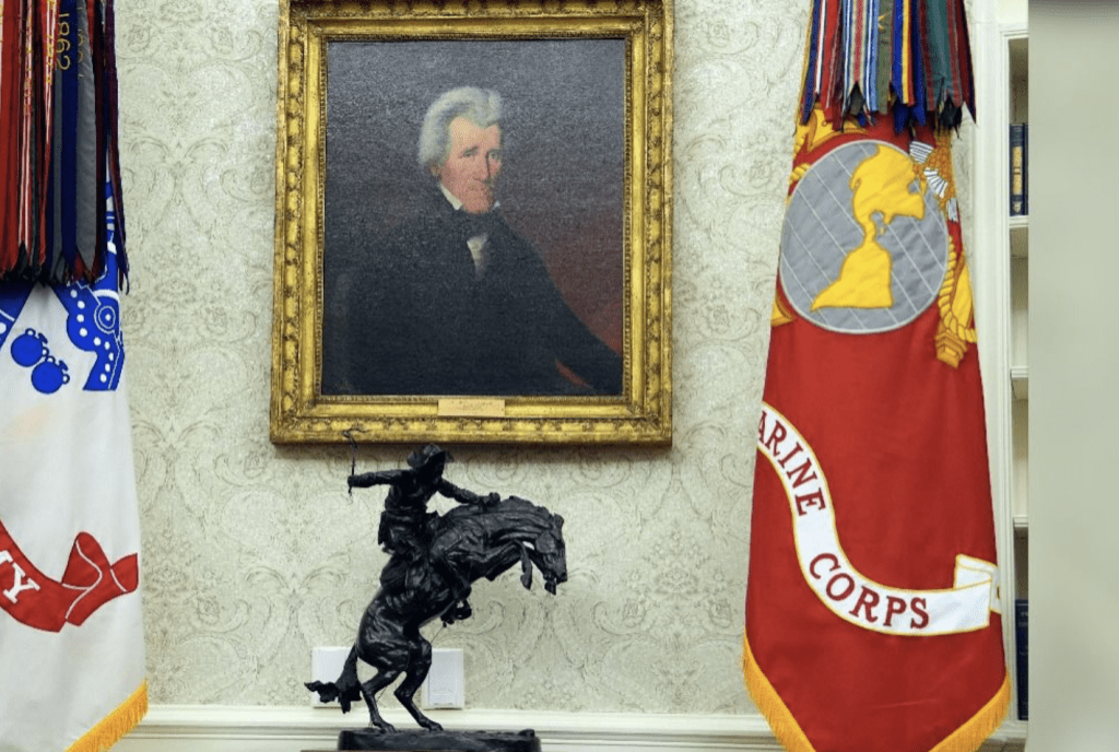 特朗普在杰克遜肖像下方擺放的了雷明頓的著名雕塑《野馬制服者》。