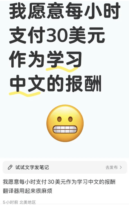 許多外國網民在小紅書上發文稱“我愿意每小時支付30美元作為學習中文的報酬”。