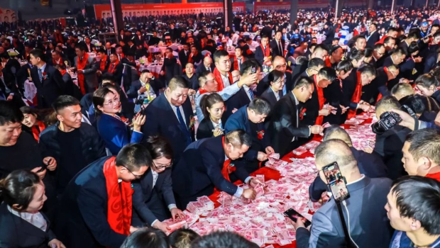 在年終會上,“河南礦山”準備了長達70米的長枱,將6000萬百元緍幣灑在枱上,其中2000萬,更是董事長崔培軍應現場員工要求,臨時加碼。