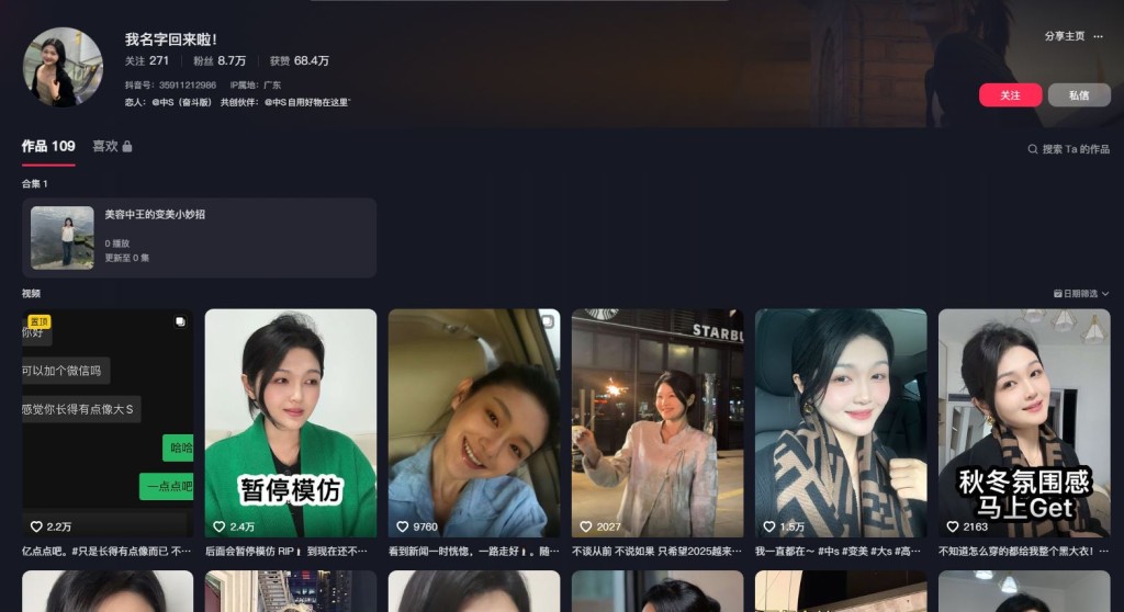 “中S”因長相與大S徐熙媛相似,依靠模仿大S走紅,在直播帶貨時增加許多流量。