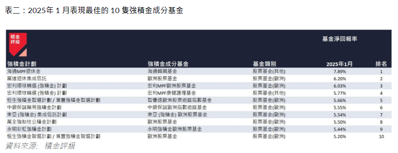 ▲2025年1月表現最佳10只強積金成分基金